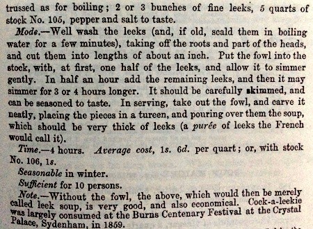 The meal would start with soup: Either cock-a-leekie or Scotch broth and this recipe from Mrs Beeton will serve 10.